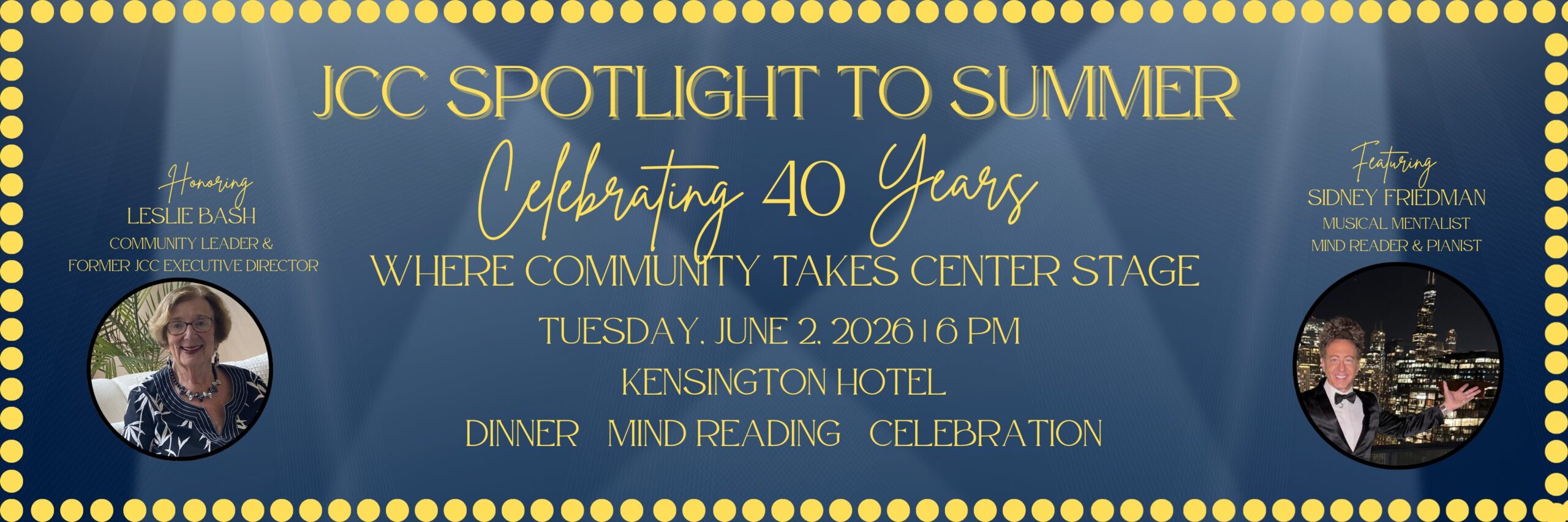 This year, we proudly mark 40 years of the JCC, while shining our brightest spotlight on honoree Leslie Bash, whose extraordinary dedication and impact have helped shape our community in lasting ways.